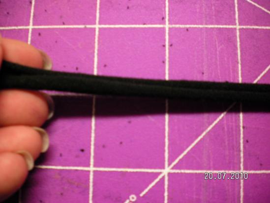 Now this part I would do on my arm, but for taking pictures I am using a yard stick. Slip your arm through so that the inch at the top that you DIDN'T cut lies on top of your arm and the strips fall on either side of it.